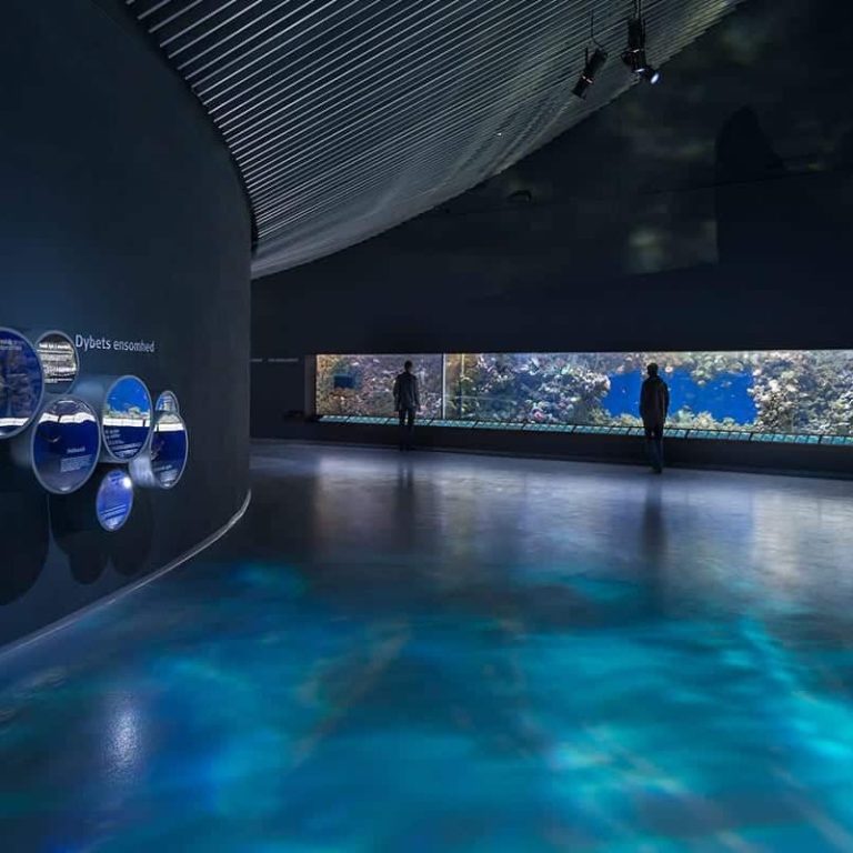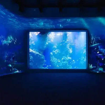 Acrylic exhibit windows and tanks which are integrated into immersive digital environments